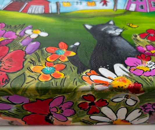 (SOLD)The Wee Black Cat is Playing Tag with the Butterflies in Nan's Garden While the Blankets for Afternoon Naps Dry on the Line